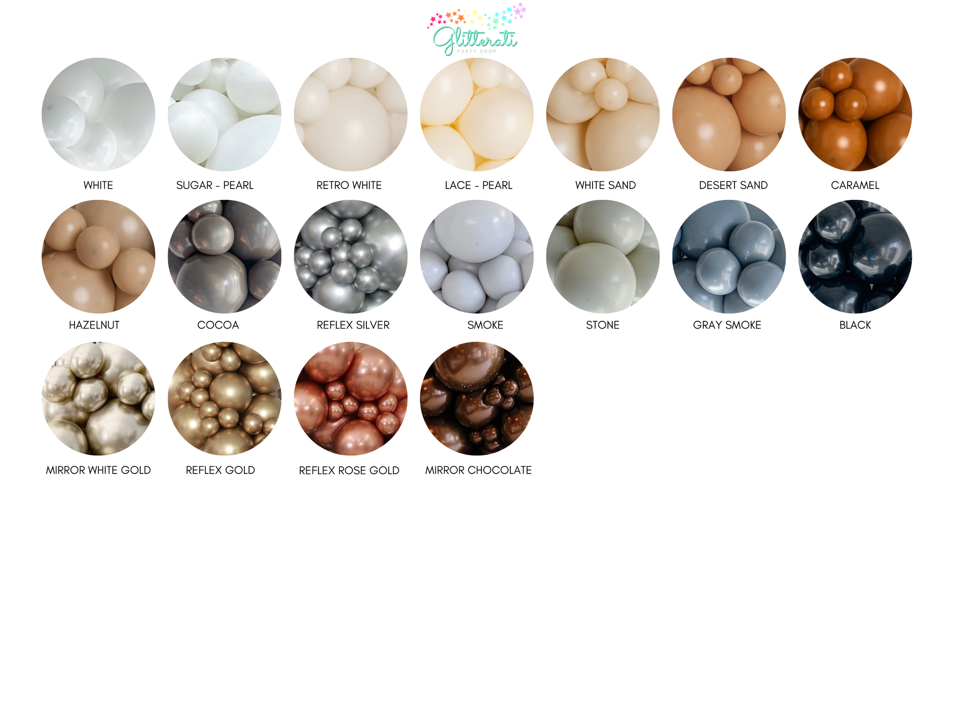 You will receive a variation of 5", 11", and 17" balloons from your selected color palette. A QR code is included in each of our kits that will take you to our DIY balloon garland assembly video!